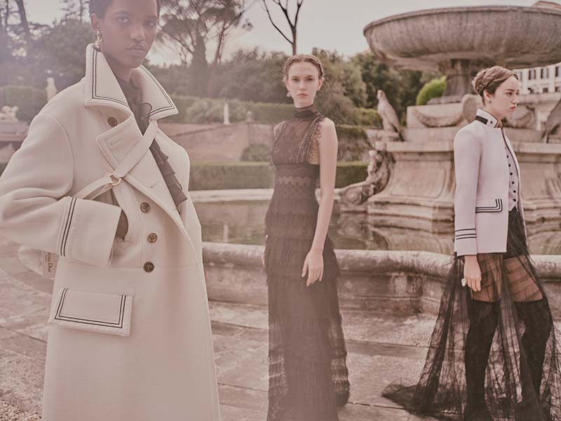 De nieuwe Cruise collectie 2026 werd gepresenteerd in de betoverende tuinen van Villa Albani Torlonia, een locatie die perfect paste bij de romantische sfeer van de collectie. De show was een ode aan de rijke cultuurgeschiedenis van Rome en aan Mimì Pecci-Blunt, een beroemde Romeinse muze die bekend stond om haar extravagante gemaskerde bals en artistieke invloed. De modellen liepen over de sfeervolle grindpaden, omringd door perfect onderhouden hagen, wat de show een intieme en magische uitstraling gaf. De zachte mist en het natuurlijke licht maakten het geheel sprookjesachtig. Een feestje voor het oog. Alle reden om niet alleen de beelden van de modeshow maar ook alles daarom heen – het doorpassen van de collectie, de groepsfoto’s, de finale – met je te delen.