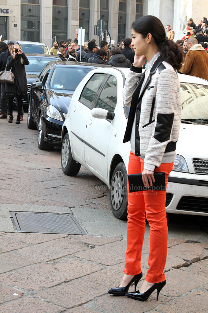 Woow! Ik vind deze oranje leren broek super! Wat me tijdens deze Fashion Week opviel, is dat de fashionista’s graag neonkleurige kledingstukken mixen met gedekte kleuren. Ik zag gisteren een zwartleren broek bij Zara in de uitverkoop maar eigenlijk is een felgekleurde leren broek zoals die van Caroline Issa wel meer up-to-date (maar ook sneller uit de mode). Wat te doen?!