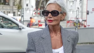 - Anti-aging is ook de combinatie leren jack met mooie, witte blouse en kokerrok.