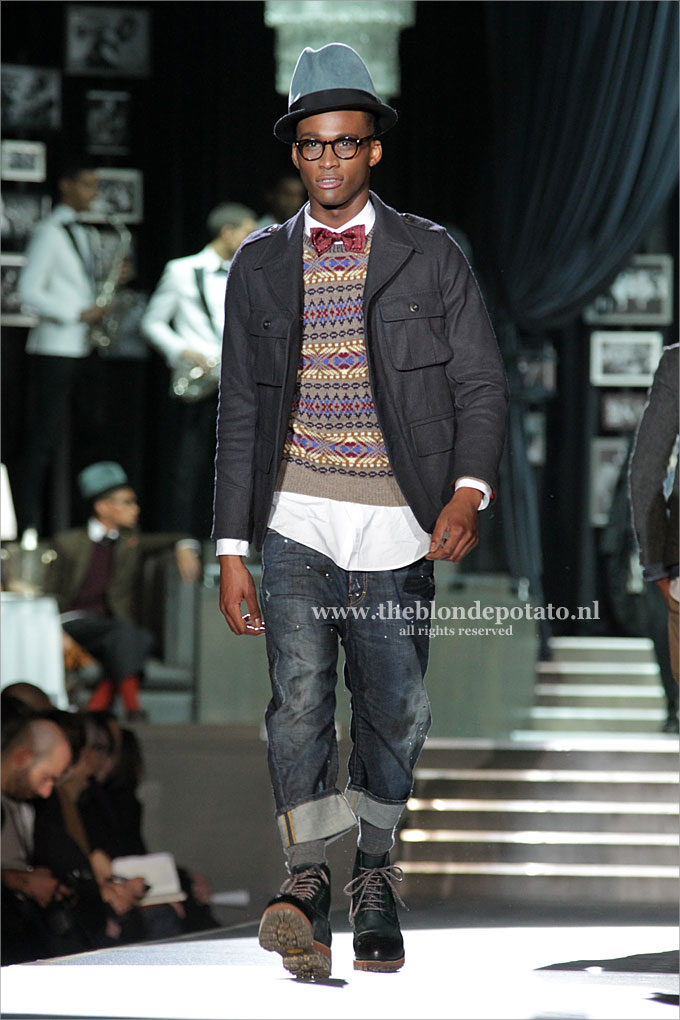 Dsquared2 did it again! De tweeling-ontwerpers Dean en Dan maakten het ook deze modeweek weer helemaal. Om 9 uur ’s morgens was het swingen. De show stond helemaal in het teken van jazz maar op de catwalk zagen we ook de gebruikelijke Dsquared2 spijkerbroeken. Een supergeslaagde mix die ook de trends voor winter 2013 2014 volgt. Want de jaren ’20, ’30 en ’40 staan weer volop in de belangstelling. De finale exit was trouwens weer typisch Dsquared2. De heren kwamen in ondergoed de catwalk op en trokken toen nog eens – op de noten van ‘Strip Polka’ van The Andrews – hun T-shirt uit. Deze show was puur genieten! En zoals je ziet had ik een heel centrale plaats voor de catwalk. Beter kon niet.